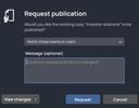 As an editor not permitted to publish a working copy, you can request to have it published. For this, click the “Request publish” button on the top bar or the “Working copies” sidebar. In the dialog that opens, optionally select a reviewer and hint at the changes to review.